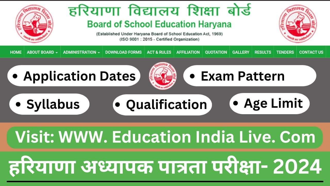 हरियाणा शिक्षक पात्रता परीक्षा 2024 की एग्जाम डेट 7 और 8 दिसंबर 2024 है. इस पात्रता परीक्षा में शामिल होने के लिए कैंडिडेट्स के पास पीजीटी के लिए मास्टर डिग्री, टीजीटी के लिए बी.एड डिग्री और पीआरटी के लिए डी.एल.एड पास की होनी चाहिए.