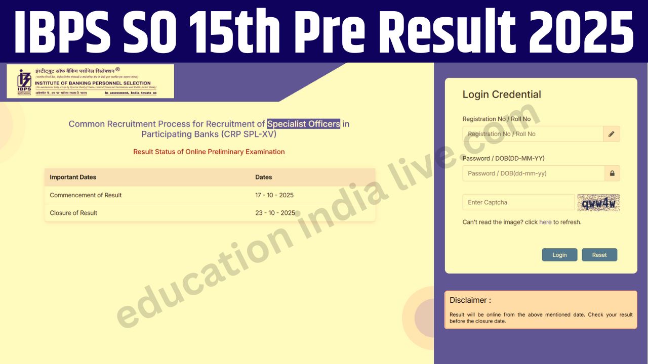 IBPS SO Result 2025 Prelims CRP SPL-XV: इंस्टीट्यूट ऑफ बैंकिंग पर्सोनेल सिलेक्शन (IBPS) द्वारा सीआरपी स्पेशलिस्ट ऑफिसर भर्ती के प्रीलिम्स एग्जाम का रिजल्ट 17 अक्टूबर को जारी कर दिया गया है. Specialist Officers CRP SPL-XV प्रीलिम्स का रिजल्ट (IBPS CRP SO Prelims Result 2025) आईबीपीएस की ऑफिसियल वेबसाइट- ibps.in पर अपलोड किया गया है. आईबीपीएस एसओ प्रीलिम्स का रिजल्ट रिजल्ट चेक करने के लिए यहां लिंक दे दिया गया है. कैंडिडेट अपना रिजल्ट रजिस्ट्रेशन नंबर/ रोल नंबर और पासवर्ड/डेट ऑफ बर्थ की मदद से चेक कर सकते है.
