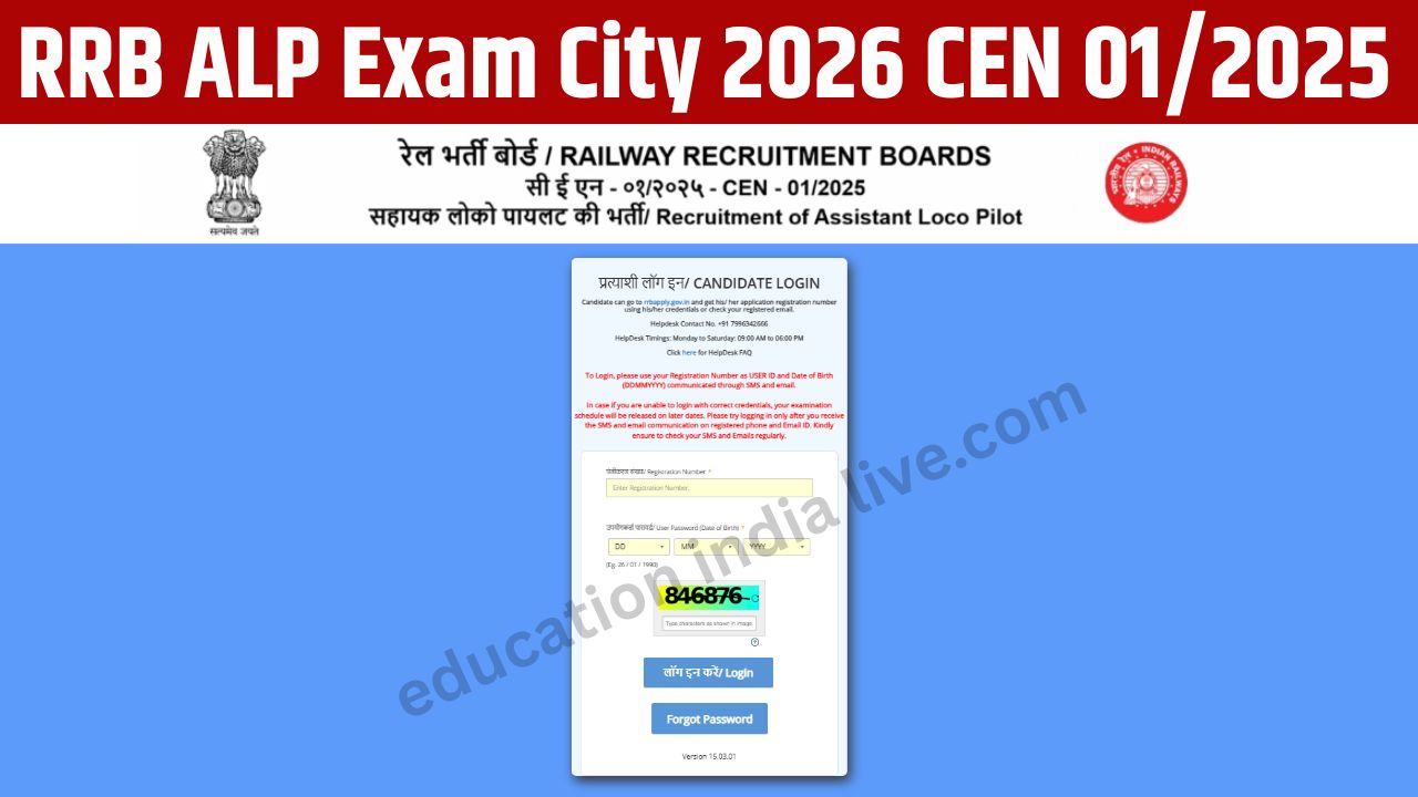 RRB ALP Exam City 2026: रेलवे रिक्रूटमेंट बोर्ड द्वारा आयोजित की जा रही असिस्टेंट लोको पायलट भर्ती CEN 01/2025 की एग्जाम सिटी 03 फरवरी को जारी कर दी गई है. RRB ALP City Intimation Slip 2026 Official Website- indianrailways.gov.in पर जारी की गई है. एग्जाम सिटी चेक करने के लिए यहां डायरेक्ट लिंक दिया हुआ है. अभ्यर्थी अपनी एग्जाम सिटी रजिस्ट्रेशन नंबर तथा डेट ऑफ बर्थ की मदद से चेक कर सकते है.