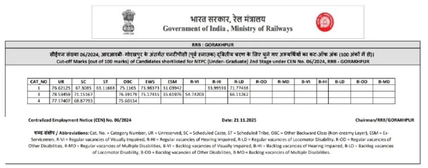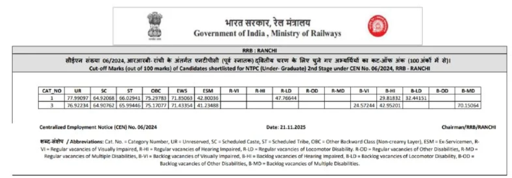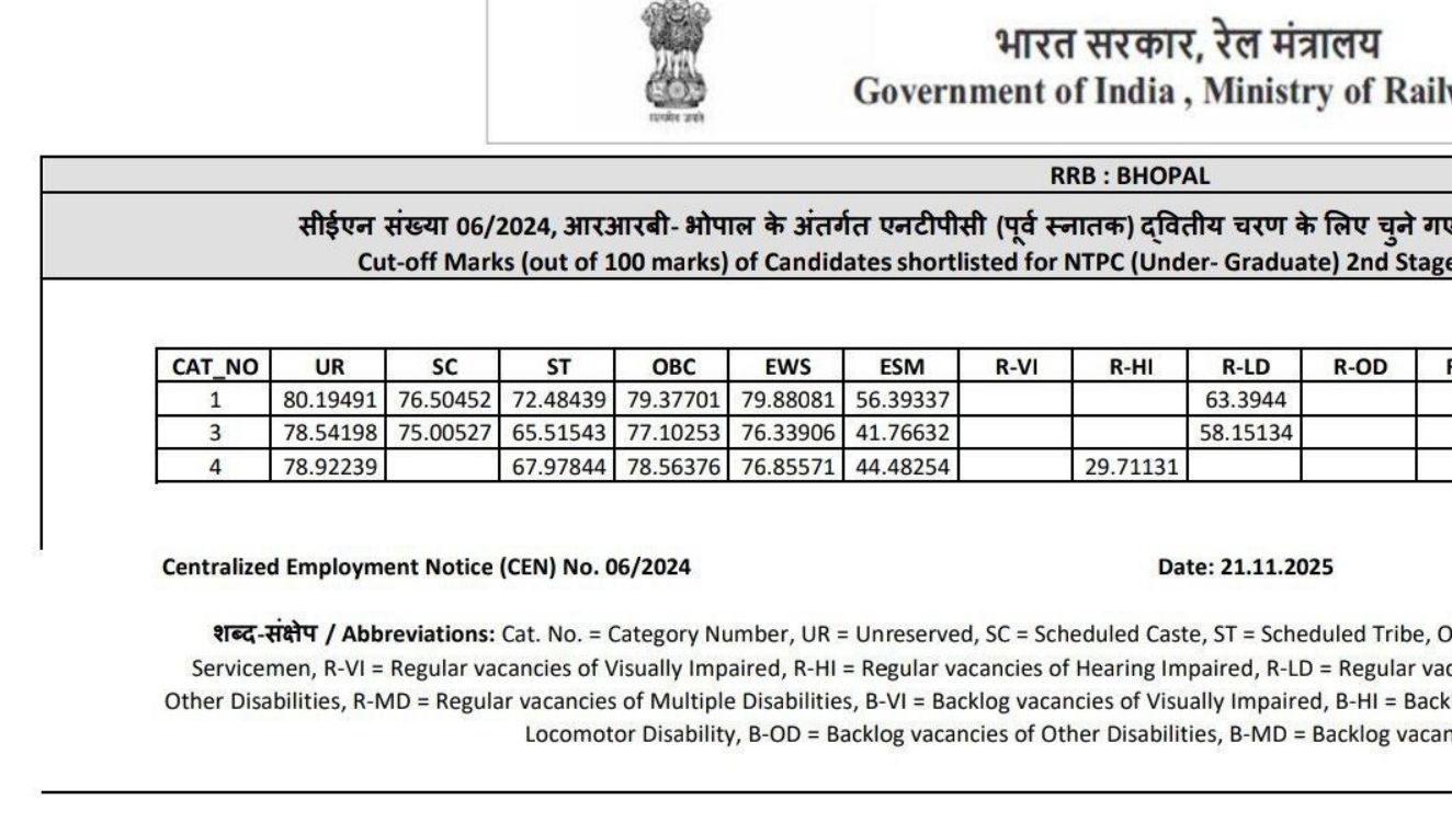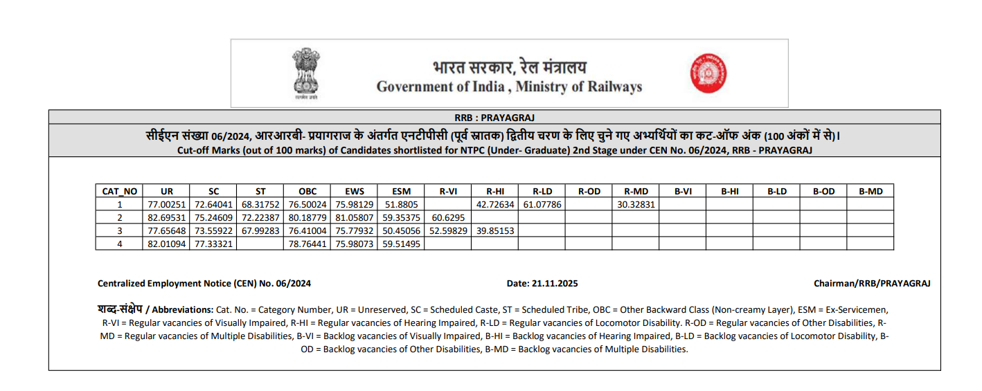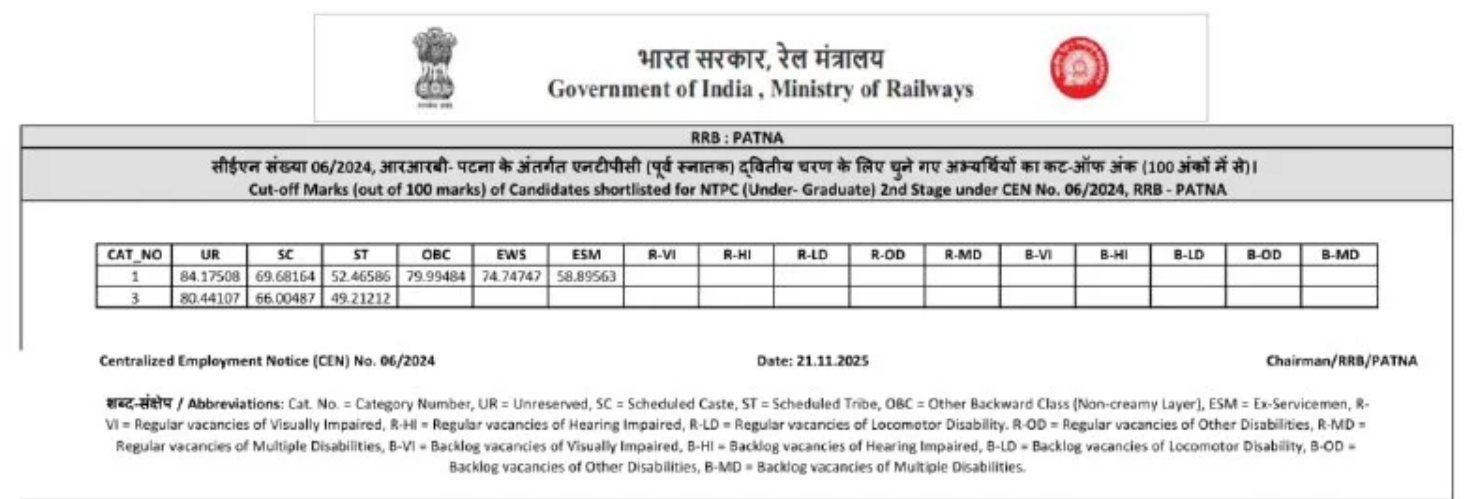 Ans. आरआरबी एनटीपीसी यूजी रिजल्ट आज 21 नवंबर 2025 को आ गया है.
