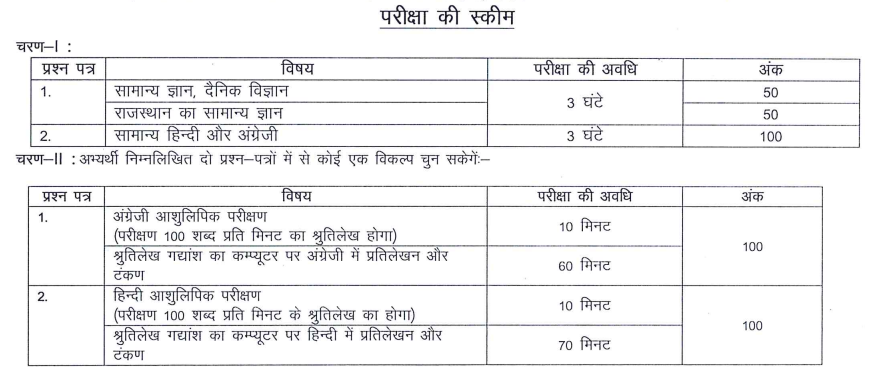 स्टेनोग्राफर और पर्सनल असिस्टेंट ग्रेड-II की यह भर्ती परीक्षा दो चरण में ली जाएगी. प्रथम चरण की परीक्षा में कुल 200 अंको के प्रश्न पूछे जाएंगे, जिसमें 50 अंक के प्रश्न सामान्य ज्ञान और दैनिक विज्ञान के, 50 अंक के प्रश्न राजस्थान के सामान्य ज्ञान से संबंधित होंगे. वहीं 100 अंक के प्रश्न सामान्य हिंदी और अंग्रजी विषय के पूछे जाएंगे. प्रथम चरण के प्रश्न पत्र में सभी प्रश्न वस्तुनिष्ठ प्रकार के होंगे. जो अभ्यर्थी प्रथम चरण की परीक्षा में सफल होंगे, उन्हें द्वितीय चरण की परीक्षा में सम्मिलित किया जाएगा.