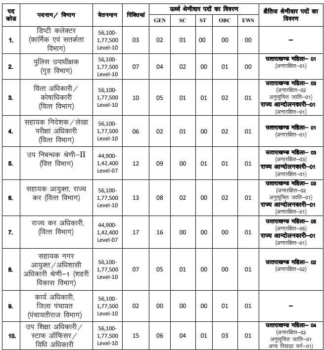 यूकेपीएससी द्वारा इस भर्ती के जरिए कुल 123 पदों को भरा जाएगा. इस भर्ती में डिप्टी कलेक्टर के 3 पद, पुलिस उपाधीक्षक के 7 पद, वित्त अधिकारी/ कोषाधिकारी के 10 पद, सहायक निदेशक/ लेखा परीक्षा अधिकारी के 6 पद, उप प्रबंधक श्रेणी-II के 12 पद, सहायक आयुक्त (राज्य कर) के 13 पद, राज्य कर अधिकारी के 17 पद, सहायक नगर आयुक्त/ अधिशाषी अधिकारी श्रेणी-I के 7 पद, कार्य अधिकारी (जिला पंचायत) के 2 पद, उप अधिकारी/ स्टाफ ऑफिसर/ विधि अधिकारी के 15 पद और जिला समाज कल्याण अधिकारी के 2 पद है.