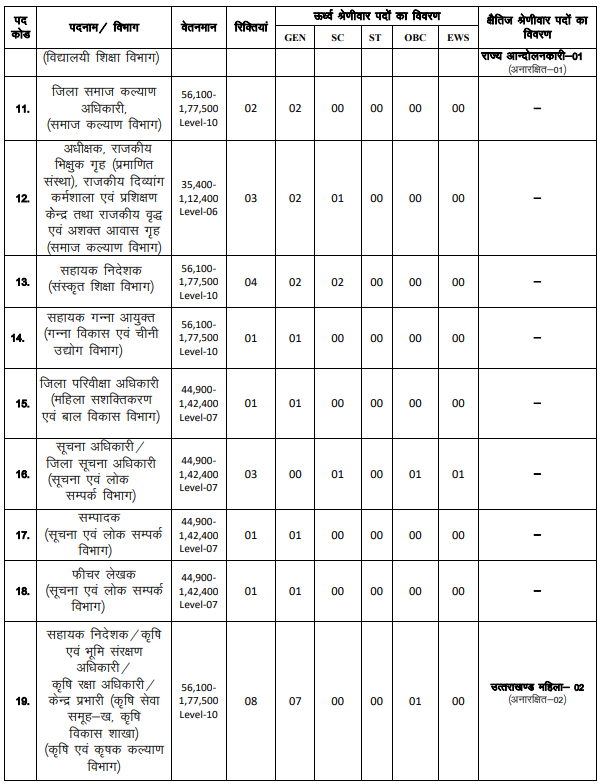इसके अलावा अधीक्षक (राजकीय भिक्षुक गृह, राजकीय दिव्यांग कर्मशाला एवं प्रशिक्षण केंद्र तथा राजकीय वृद्ध एवं अशक्त आवास गृह) के 3 पद, सहायक निदेशक के 4 पद, सहायक गन्ना आयुक्त का 1 पद, जिला परिवीक्षा अधिकारी का 1 पद, सूचना अधिकारी/ जिला सूचना अधिकारी के 3 पद, संपादक का 1 पद, फीचर लेखक का 1 पद, सहायक निदेशक/ कृषि एवं भूमि संरक्षण अधिकारी/ कृषि रक्षा अधिकारी/ केंद्र प्रभारी के 8 पद तथा सहायक निदेशक कृषि सेवा श्रेणी-II का 1 पद है.