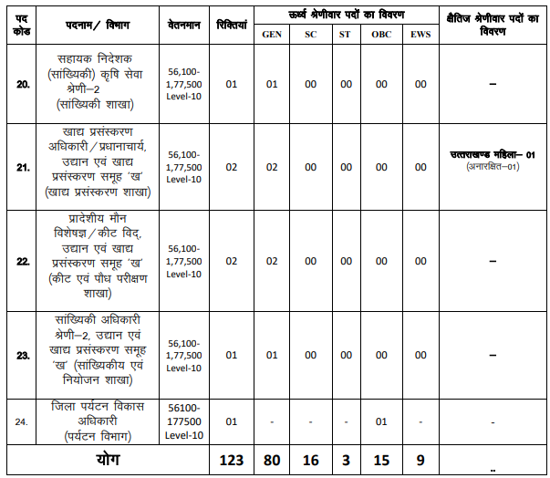 वहीं खाद्य प्रसंस्करण अधिकारी/ प्रधानाचार्य, उद्यान एवं खाद्य प्रसंस्करण समूह ‘ख’ के 2 पद, प्रादेशीय मौन विशेषज्ञ/ किट विद्, उद्यान एवं खाद्य प्रसंस्करण समूह ‘ख’ के 2 पद, सांख्यिकी अधिकारी श्रेणी-II, उद्यान एवं खाद्य प्रसंस्करण समूह ‘ख’ का 1 पद और जिला पर्यटन विकास अधिकारी का 1 पद है.
