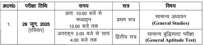 यूकेपीएससी द्वारा पीसीएस का प्रीलिम्स एग्जाम 29 जून 2025 को दो पारियों में होगा. प्रथम पारी में पेपर-1 सामान्य अध्ययन का सुबह 10 बजे से दोपहर 12 बजे तक होगा, जबकि द्वितीय पारी में पेपर-2 सामान्य बुद्धिमत्ता परिक्षण का दोपहर 2 बजे से शाम 4 बजे तक होगा.